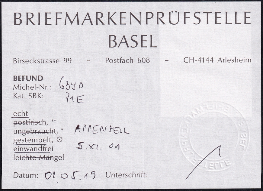 Schweiz, Stehende Helvetia, Nr.71E, 1Fr.lila, sauber gestempelt APPENZELL, Befund BPB