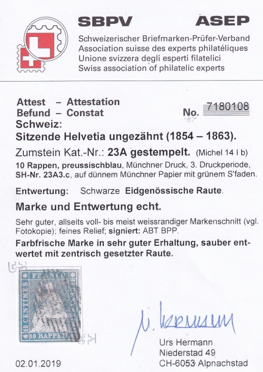 Schweiz Strubeli 1854 Nr. 23 A Raute, Attest Hermann