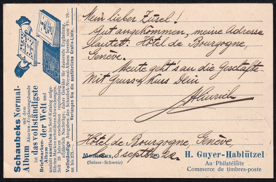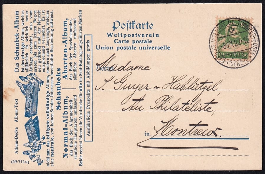 Schweiz, Tellbrustbild Nr.153,auf illustrierter Karte dvon Guyer-Hablützel, Schaubek-Alben Montreux, gestempelt EXPOSIT. INTERNAT. DE TIMBRE-POSTE GENEVE