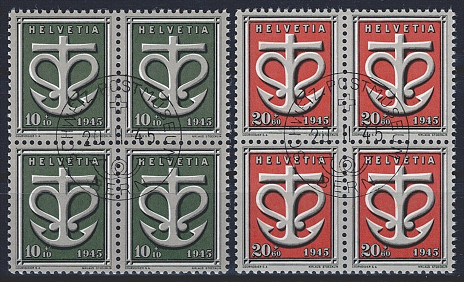 Schweiz, Zuschlagsausgaben, Nr.19-20, Schweizer Spende 1945, im Viererblock, ET-Stempel SCHWEIZ.POSTMUSEUM