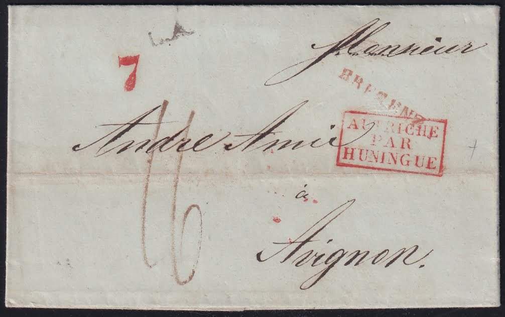 Vorphilatelie Österreich 19.12.1836 „Bregenz (Vorarlberg)“ => „Hüningen“ => „Avignon“