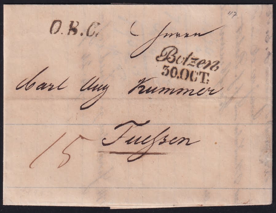 Vorphilatelie Österreich 30.10.1847 „Bozen (Tirol)“ => „Füssen (Bayern)“