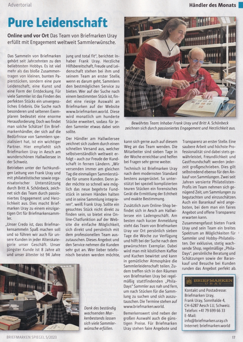 Ein Artikel über uns, „Händler des Monats“ in der aktuellen Ausgabe des Briefmarken Spiegel